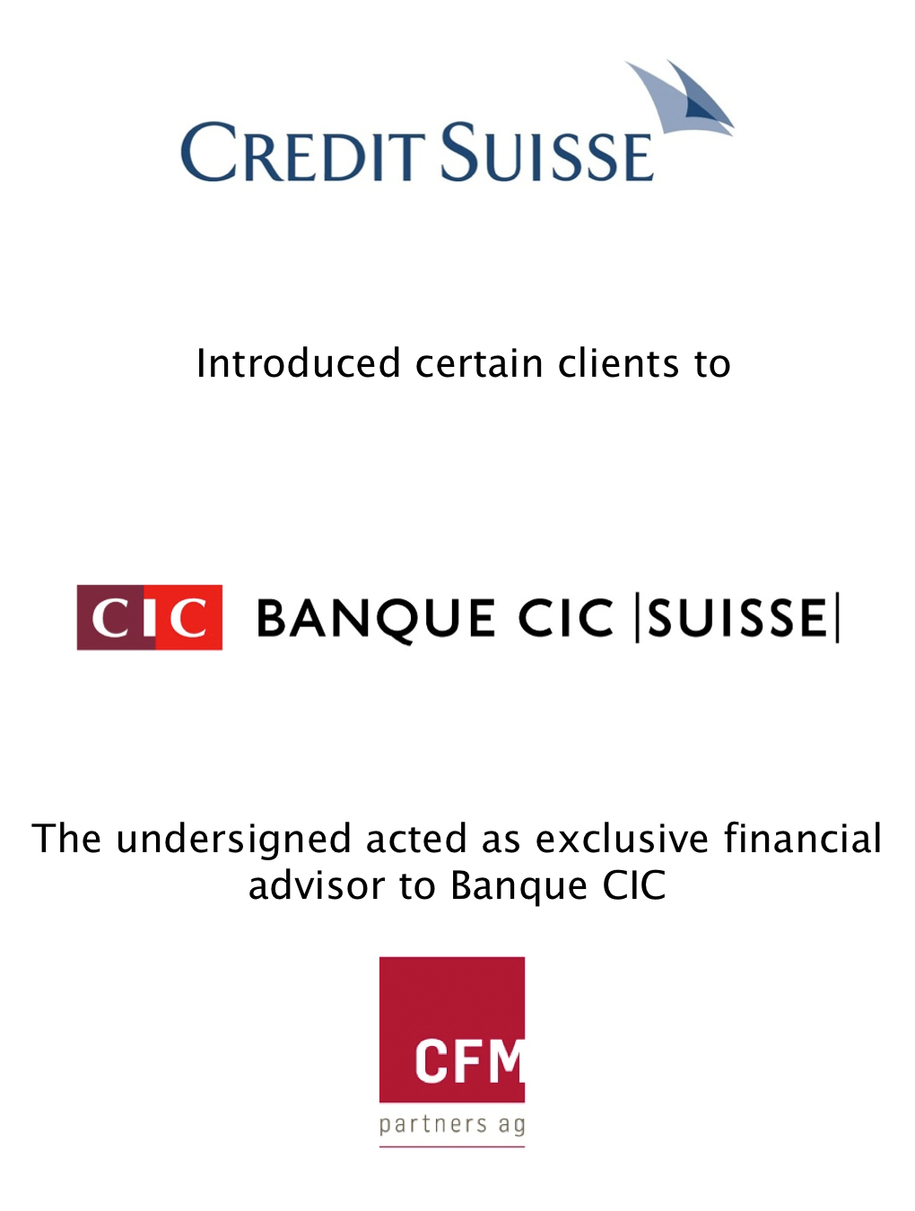 • CFM advised Banque CIC (Suisse) exclusively on the analysis and valuation of the client book and the negotiation of the referral agreement.
