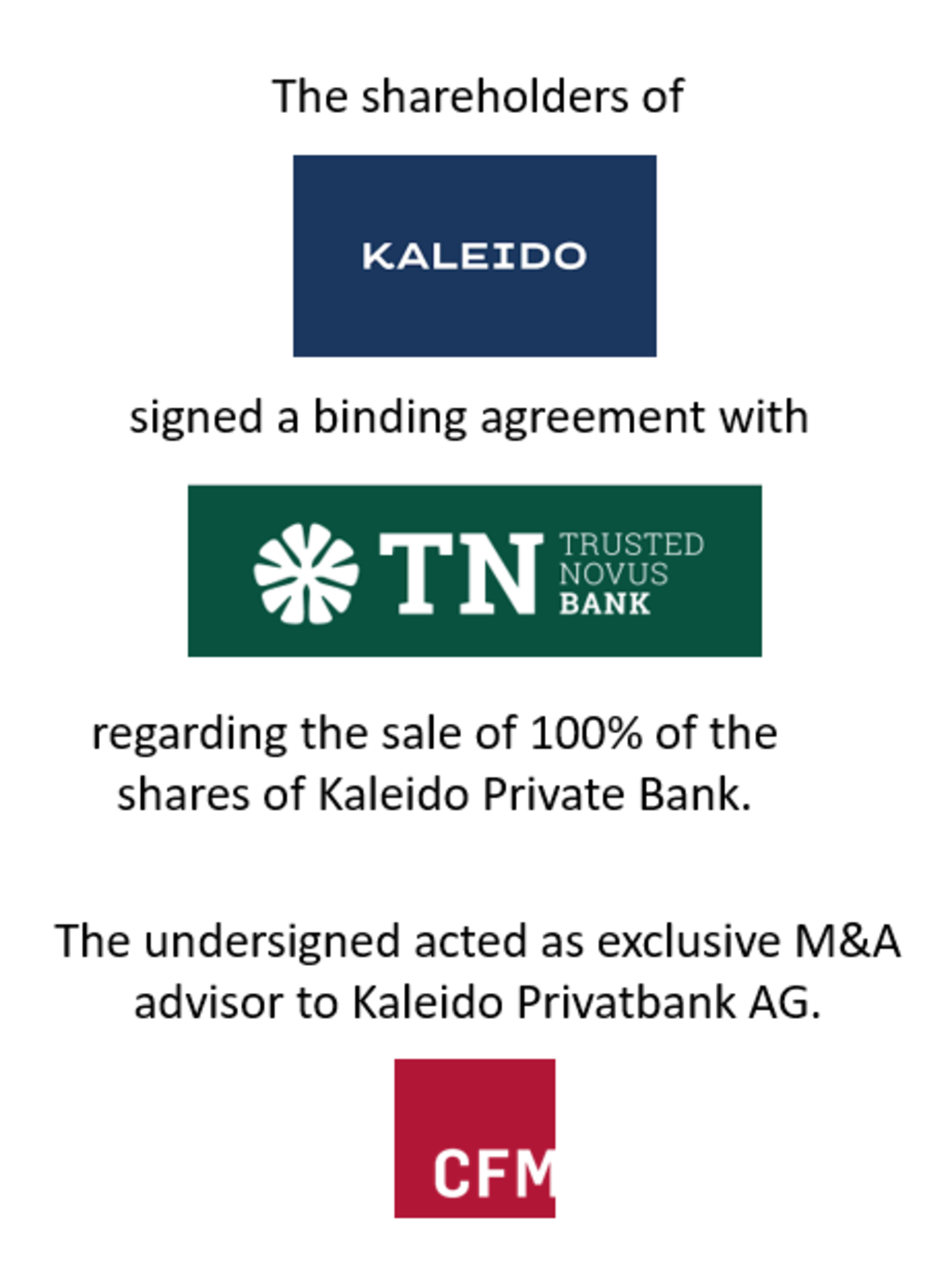 • CFM acted as exclusive M&A advisor to the shareholders of Kaleido Privatbank AG.
