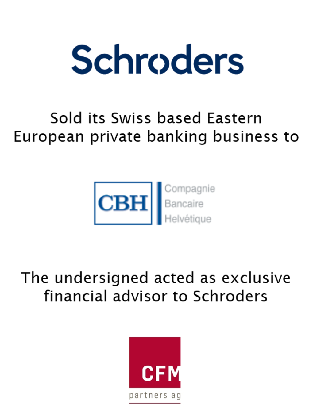 - CFM advised Schroders exclusively on the sale of its Eastern European private banking business.