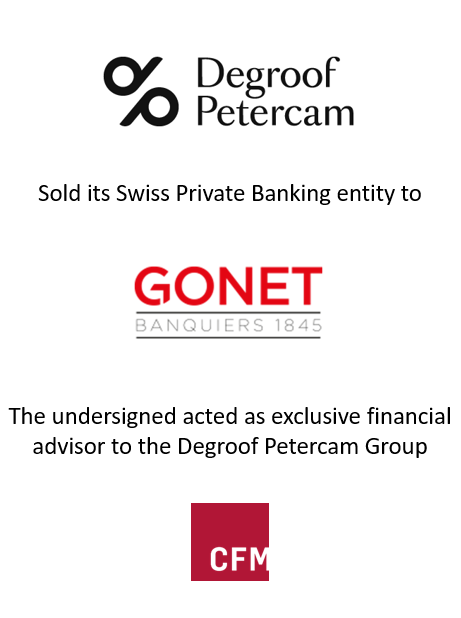 - CFM partners ag advised Banque Degroof Petercam SA, a Belgian banking group, upon the disposal of its Geneva-based private banking entity to Gonet & Cie SA as part of its refocus of private banking activities on Belgium, Luxembourg and France.