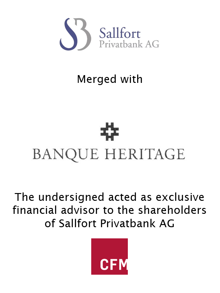 - Following a strategic review, the shareholders of Sallfort came to the conclusion that its long-term ambitions could be best executed by joining forces with an entrepreneurial partner featuring a compatible family heritage. In November 2018, the agreement to merge with Banque Heritage SA (“Heritage”) was signed, forming a private bank managing client assets of c.CHF 6bn.