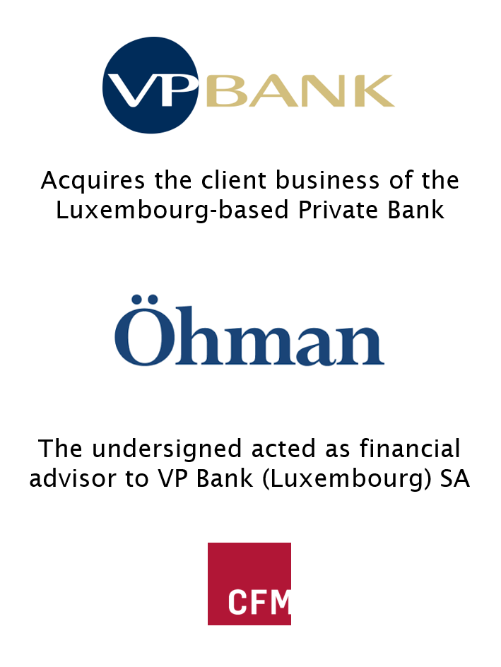 - Following a shift of the Öhman Group over the last years towards asset management, the private banking operation in Luxembourg was considered non-core. In line with VP Bank's “Strategy 2025”, VPB has entered into an asset transfer-agreement to acquire the client business of Öhman. The transaction involves the acquisition of about 11 employees and client assets of approx. EUR 760 million.